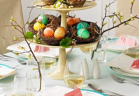 For your dinner table, a two tier dish with Easter egg filled nests will be a wonderful option to try this year. It is easy to make and will complement the bold colors of your table’s center piece with a single color name card and napkins with an Easter egg pattern.